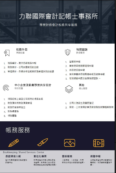 企業和公司行號採用外包(Outsourcing)的優勢主要在於人事、系統及營運成本的降低、避免組織過於膨脹,及減輕內部控制的壓力,更重要的是讓資源能集中在事業的核心業務。力聯國際會計記帳士事務所,由產業界資歷豐富的財會人員從事各項帳務作業,在會計作業上符合政府法令的規範。採用數位掃描方式記錄所有相關交易憑證,從帳務紀錄到報表產出及相關稅務申報提供一站式服務。所有的紀錄在雲端上,公司可隨時查找及列印。也可將交易記錄匯出,上傳至報表分析軟體,供公司經營者及管理階層進行進一步分析,當作管理決策的依據。